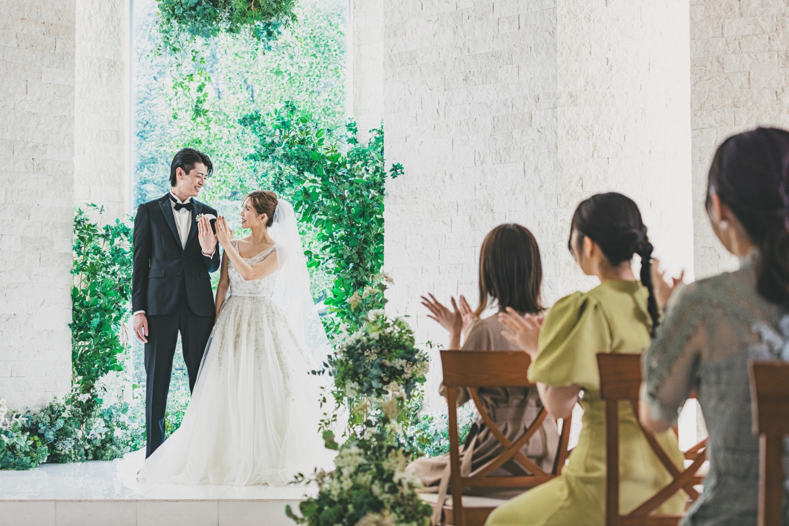 天井まで続く大きな窓からは光と緑が降り注ぎ、お2人を照らしてくれます。感動的な生演奏と天井高を生かしたセレモニーが人気!2階席も設置しており最大110名まで収容可能。#森の中のチャペル